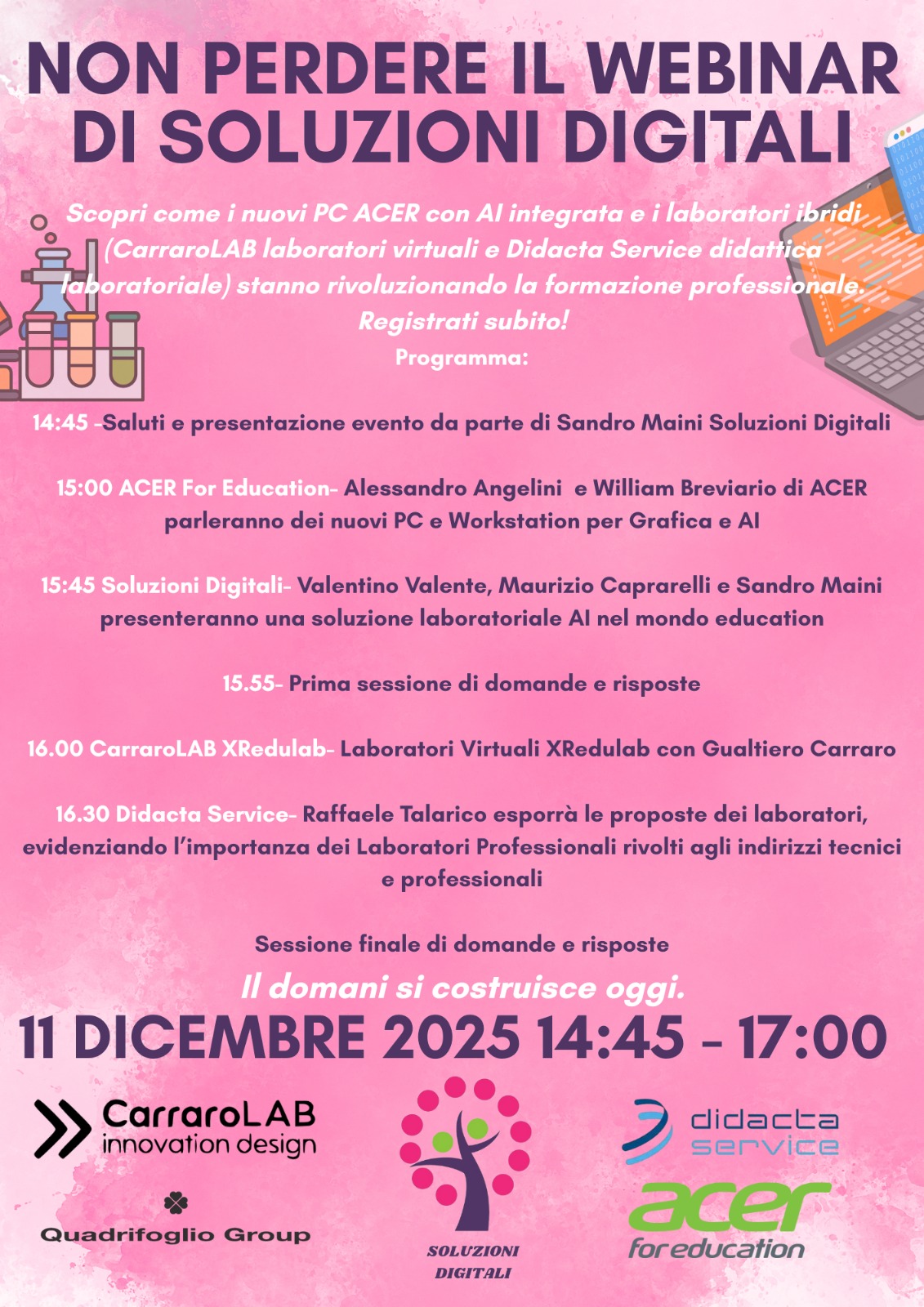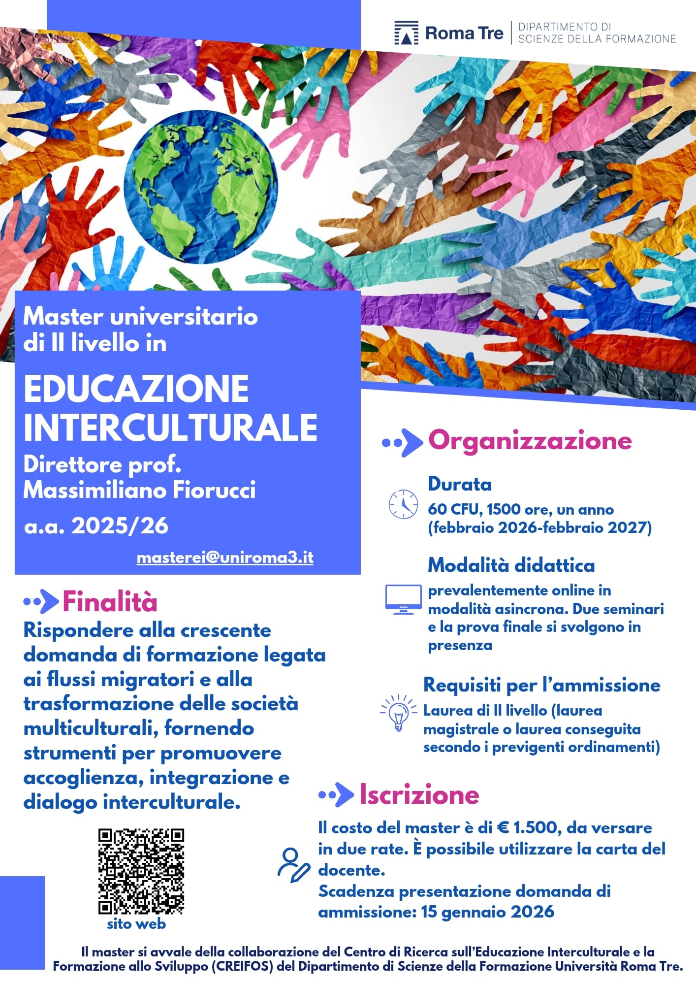 Stampa / Condividi Stampa Invia Condividi Facebook Twitter Linkedin AnnuncioAllegatiData di pubblicazioneData di scadenza Master universitario in Educazione Interculturale – Università Roma TreLocandina Master8-10-202515-01-2026 Convegno "Tra povertà e precarietà. Quale futuro per il lavoro"13-10-202529-10-2025 Attività di formazione - IS Augusto Romagnoli - PROGRAMMAZIONE ANNUALEProgetti IS Augusto Romagnoli - UNA VOLTA C'ERA Progetti IS Augusto Romagnoli - SCUOLA AMICA del BRAILLE15-10-2025a.s. 2025-26 Corsi di lingua inglese - personale e adulti esterni - Liceo Anco MarzioModulo iscrizione ai corsi di lingua16-10-202525-11-2025 Master di primo livello LUMSA: "Scuola in ospedale e istruzione domiciliare: pedagogia, didattica e inclusione educativa"21-10-202531-01-2026 LA SCUOLA NON SI ARRUOLA. Contro la militarizzazione della cultura, contro il riarmo e le politiche di guerra, per sostenere la Palestina. Costruiamo l’alternativa.22-10-202504-11-2025 Incontri di formazione "La forza della Poesia" - Università degli Studi Tor VergataLA SCUOLA NON SI ARRUOLA. Contro la militarizzazione della cultura, contro il riarmo e le politiche di guerra, per sostenere la Palestina. Costruiamo l’alternativa.23-10-2025 Convegno 30 ottobre LUMSA "Il potere trasformativo dell'educazione23-10-202530-10-2025 Convegno "Progettare il nostro futuro insieme: in cammino per un patto educativo comune" IIS "Confalonieri - De Chirico"24-10-20257/9-11-2025 10 novembre, ITALIANO PER LO STUDIO - Webinar gratuitoScheda descrittiva 1 Scheda descrittiva 2 Scheda descrittiva 3 Scheda descrittiva 4 24-10-202510-11-2025 Nuova edizione corso MIM Sofia didattica innovativa e Canva 30-10-202512-01-2026 Corsi di Aggiornamento Nazionale Accreditato MiurCorso Miur PILA 12-16 Gennaio 2026 Corso Miur PILA 19-23 Gennaio 2026 Corso CSEN FRABOSA 24-28 Febbraio 2025 Corso CSEN MIUR FRABOSA MARZO 2026 Corso SESTRIERE 26 - 30 202603-11-20252026 (dettaglio date negli allegati) Corso di formazione la forza della poesia 2025/202606-11-2025inizio corso 12-11-2025 Corso di formazione per docenti “Un mondo tra pace e guerra”06-11-2025inizio corso 13-11-2025 Formazione docenti "La scuola e le sfide della società"Corso di formazione per docenti “Un mondo tra pace e guerra”10-11-2025inizio corso 11-11-2025 L'arte per capire l'uomo - Master 80 ore14-11-2025 VI Congresso della Federazione Italiana Mathesis 2025Locandina Congresso Udine17-11-202528-29-30/11/2025 L'arte, officina di idee e culture II edizioneBrochure corso arte24-11-2025febbraio e aprile 2026 L'arte, officina di idee e culture II edizioneBrochure corso arte24-11-2025febbraio e aprile 2026 Webinar Esclusivo: AI e Nuovi Laboratori Professionalizzanti - Soluzioni Digitali & PartnerLocandina evento28-11-202511-12-2025 Abbonamento annuale a 70 corsi accreditati MIM01-12-2025Attivazione corsi dal 27 novembre all'8 dicembre 2025 Master in Intelligenza Emotiva negli ambienti di apprendimento4-12-202510-12-2025 Corso di formazione sull'educazione emozionale a scuolaMaster in Intelligenza Emotiva negli ambienti di apprendimentoLocandina corso4-12-202516-17 gennaio 2026 Corso di formazione sull'educazione emozionale a scuolaMaster in Intelligenza Emotiva negli ambienti di apprendimentoLocandina corso4-12-202516-17 gennaio 2026 Convegno ArtisticaMente 2026Locandina convegno 8-12-202514-02-2026 Corsi di formazione "Acacia"10-12-202519-02-2026 Fondazione Mondo Digitale - formazione docentiLocandina proposte12-12-2025a partire da gennaio 2026 Master universitario in Educazione Interculturale – Università Roma TreLocandina Master12-12-2025febbraio 2026 - febbraio 2027 Master in Metodologie innovative e inclusive di insegnamento e di apprendimento7-01-2026 La Comunicazione Aumentativa Alternativa (CAA): strategie, indicazioni pratiche e strumenti operativi per la didattica e linclusione di alunni con bisogni comunicativi complessi7-01-2026dal 11 al 26 febbraio 2026 Formazione Università LINK8-01-2026 AND - Corsi di formazione "ASPETTI LEGALI DELL'INFORMAZIONE IN RETE"15-01-2026a partire da marzo 2026 Webinar Orizzonte Scuola: Intelligenza artificiale per velocizzare il tuo lavoro15-01-202620-01-2026 dir scuola - webinar IA15-01-202621-01-2026 Artedo Network - Master “L’arte di insegnare - Emozioni, conflitto e metodi attivi di apprendimento per il II ciclo d’istruzione”15-01-2026 “Master in Intelligenza Emotiva negli ambienti di apprendimento”21-01-2026 Segnalazione corso su orientamento universitario e transizioni formative: pratiche per l'accompagnamento efficace21-01-2026 SguardiAttivi Incontri gratuiti online per docenti26-01-2026 Corso di didattica speciale, apprendimento e tecnologia assistiva per la disabilità visiva “Alberto Bianchelli”7-02-202628-02-2026 e 01-03-2026 Corsi di formazione Fondazione InterculturaPresentazione corsi7-02-202610-03-2026 Proposta formazione gratuita docenti - Fondazione Mondo Digitale7-02-2026 Istituto di Psicosintesi Roma - date10-02-2026 Corso Sestriere 23 - 27 marzo 202612-02-2026dal 23 al 27 marzo 2026 Formazione insegnanti: "Gli ebrei questi (s)conosciuti"16-02-20264-12-18-25 marzo 2026 Lincei "Immunità e Vaccini" Corso in presenza - Polo di Roma16-02-202619-02-2026 OLTRE LE BARRIERE XXII Settimana di azione contro il razzismo23-02-2026dal 14 al 22 marzo 2026 Seminario regionale di formazione personale A.T.A.Seminario 23-02-20262-03-2026 Percorso di formazione "Sviluppare competenze educative per l'inclusione e la gestione della complessità scolastica su piattaforma S.O.F.I.A.23-02-2026marzo-giugno 2026 FederATA stipula una convenzione con AICA per conseguire la DigComp2.2 e la DigCompEduLocandina prezzi03-03-2026 “Master online – Gestione della classe e dinamiche relazionali”10-03-2026 Educare al futuro: strumenti scientifici per insegnare clima, salute e sostenibilitàProgramma evento10-03-202618-03-2026 “The School of Ants: a scuola con le formiche”Programma evento Brochure10-03-202625-03-2026 CORSO DI A